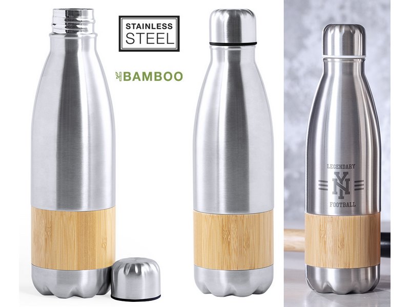 Een natuurlijnfles, in een combinatie van mat afgewerkt roestvrij staal en bamboe.