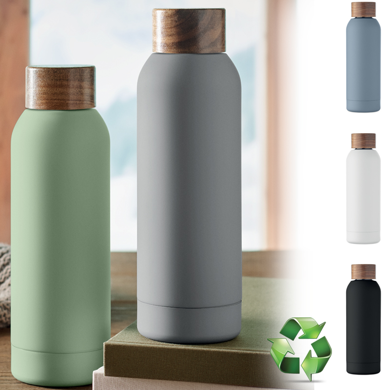 Enkelwandige fles van gerecycled roestvrij staal (90% gerecycled roestvrij staal en 10% roestvrij staal) met rubberen afwerking en een acaciahouten deksel.