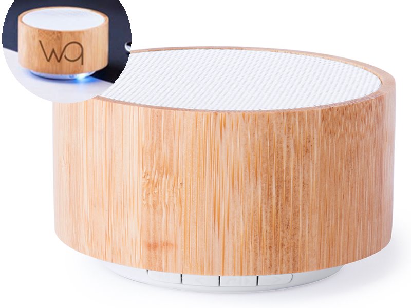 Bluetooth speaker in bamboe behuizing met handsfree oproepfunctie, FM–radio en ingebouwde oplaadbare batterij.