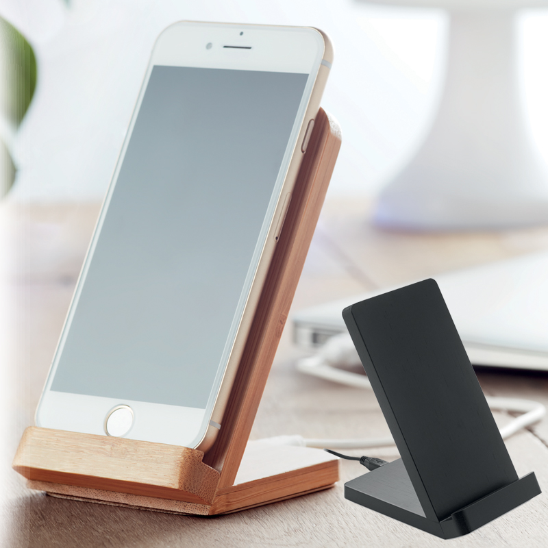 Bamboe telefoonstandaard met draadloos opladen functie.