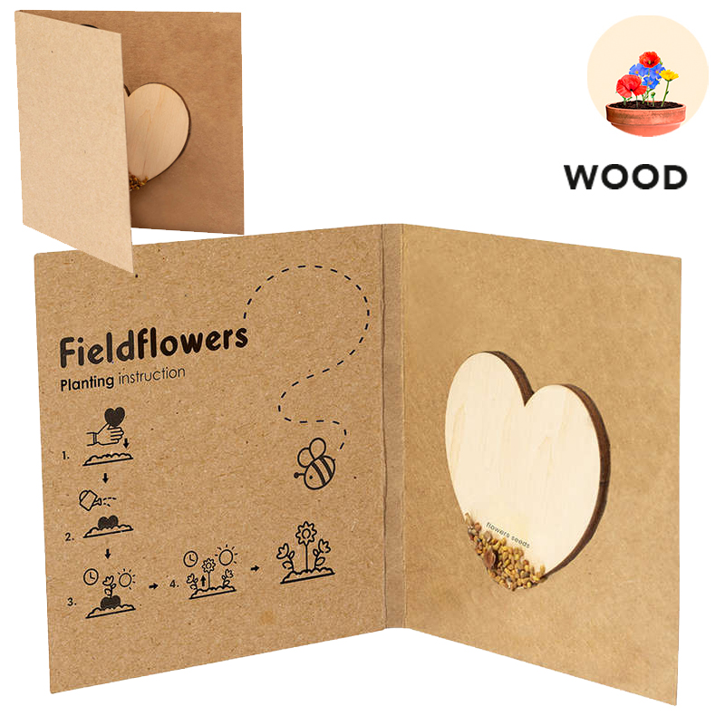 Hart van zaden gemaakt van natuurlijk hout, met zaden van wilde bloemen klaar om te planten en met een groot merkgebied aan de achterkant van het hart.
