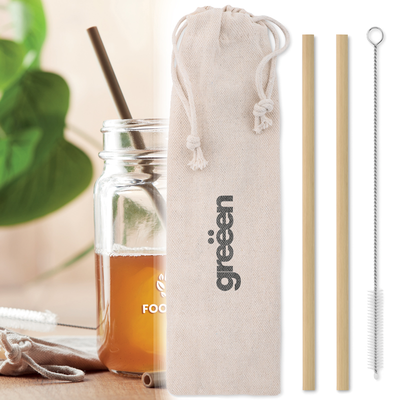 Twee herbruikbare bamboe rietjes met RVS-nylon borsteltje om de rietjes goed schoon te maken na gebruik.
