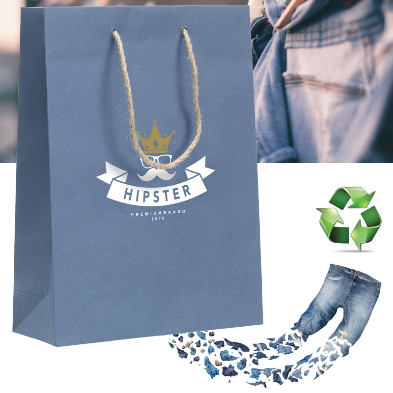 Stevige ECO geschenktas (maat M) gemaakt van gerecycled papier met jeansvezels (180 g/m2).