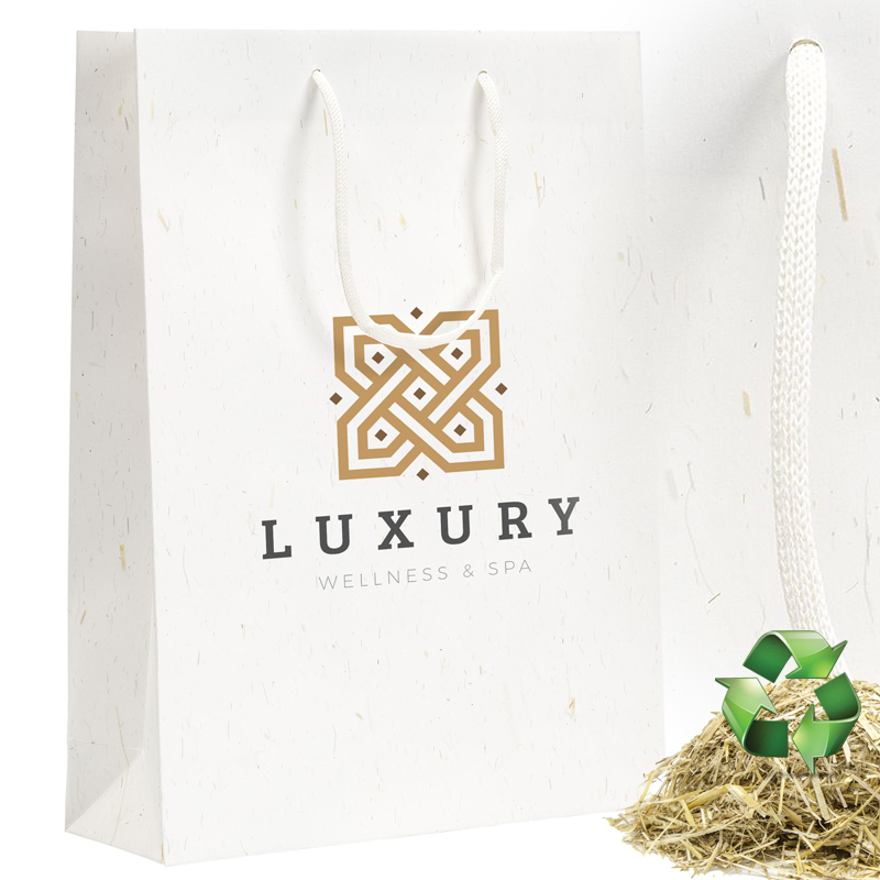Stevige ECO papieren geschenktas (maat L) gemaakt van gerecycled papier met strovezels (180 g/m2).