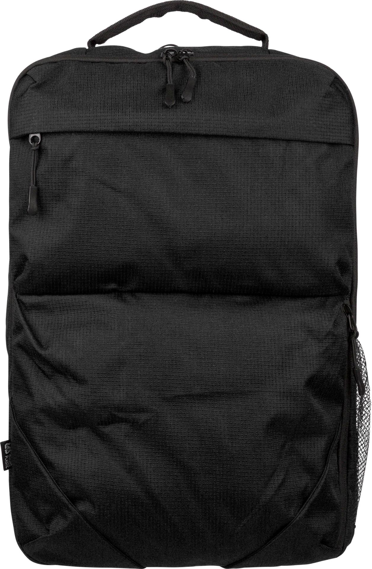 Rugzak van rPET 300D polyester Ocean Bound, gemaakt van gerecycled plastic afval uit de oceaan, geweven tot een duurzaam textiel met een textuurafwerking.