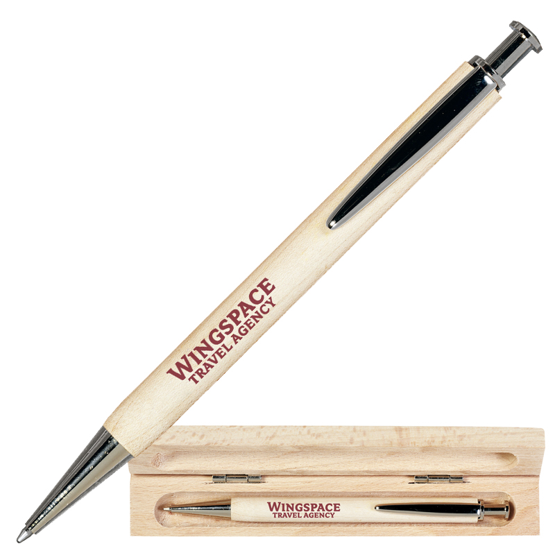 Blauwschrijvende balpen van massief beukenhout met verchroomde clip, drukknop, puntstuk.