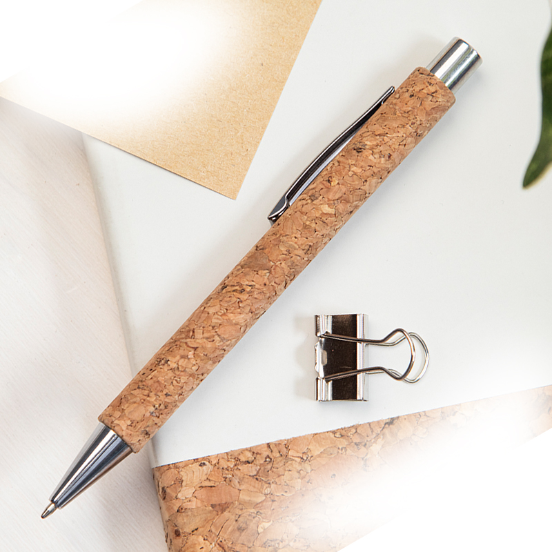 Balpen van gerecycled papier met natuurlijke kurk en metalen onderdelen.