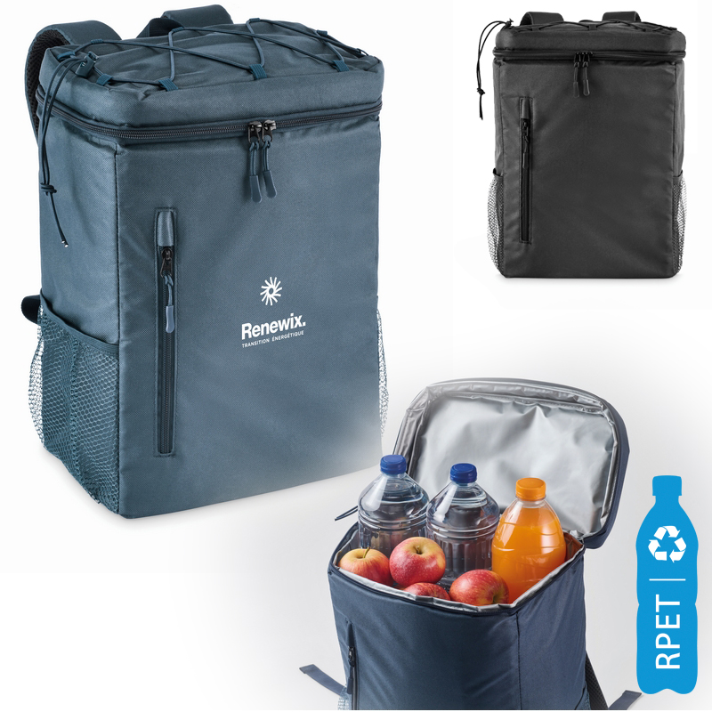 Koelrugzak van 600D RPET polyester met gevoerde, verstelbare schouderbanden, PEVA–voering en 5 mm PE–schuimisolatie.