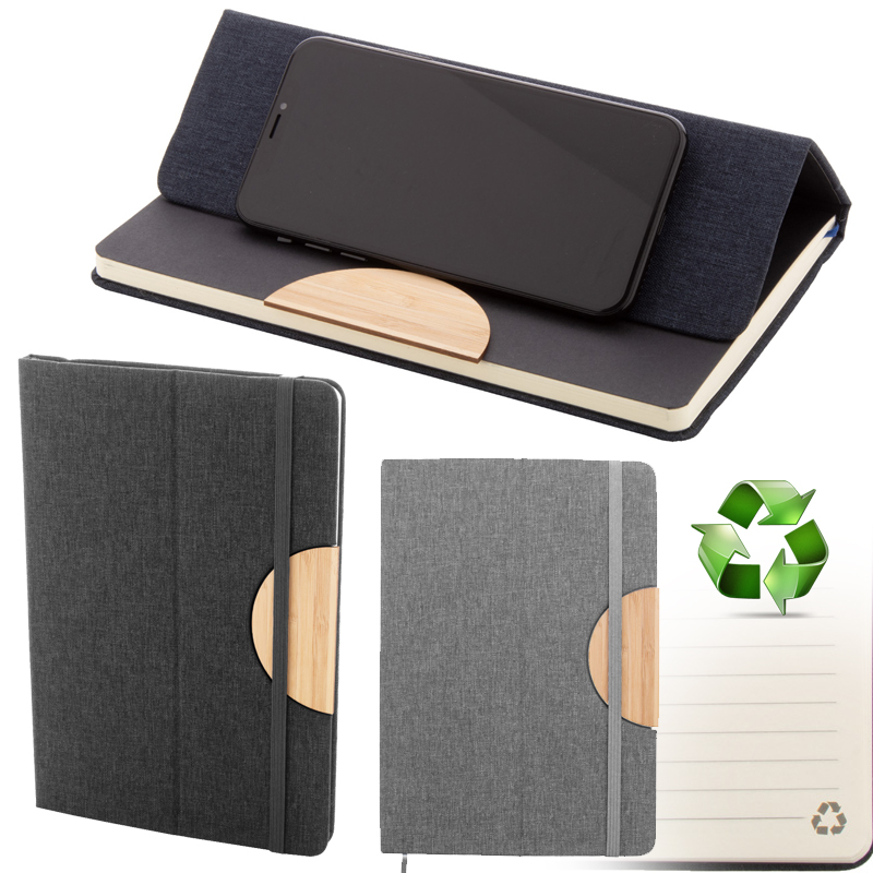RPET polyester omhuld notitieboek met bamboe inzetstuk en mobiele houderfunctie.