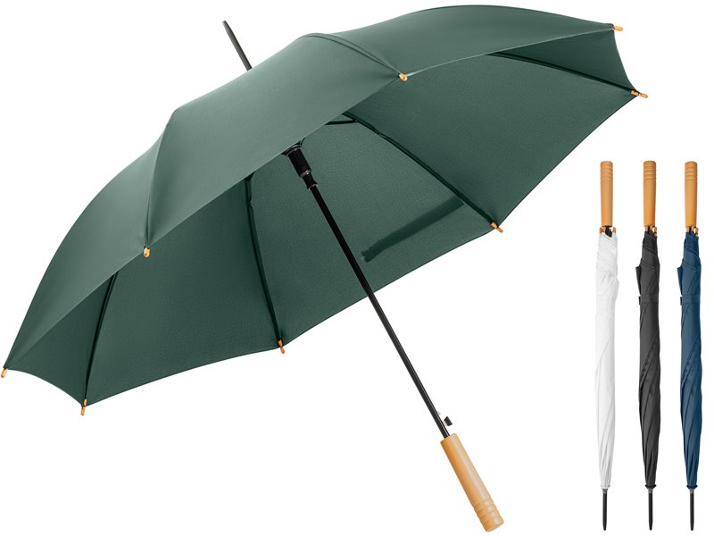 RPET pongee paraplu met automatische opening, metalen frame en kabel en houten handvat.