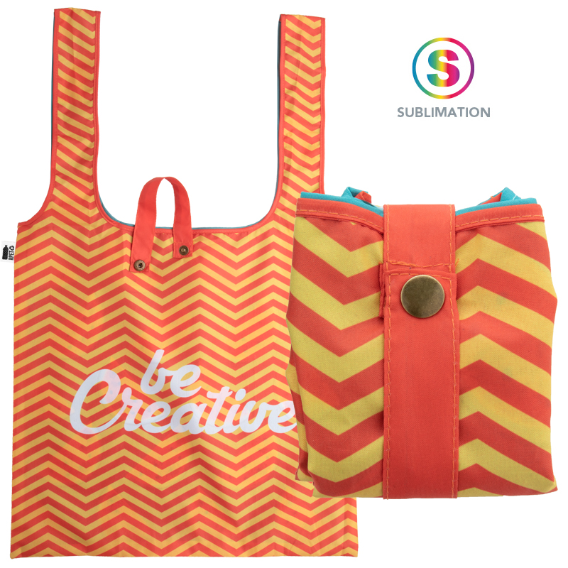Custom made RPET opvouwbare boodschappentas. Met all-over sublimatiedruk afbeeldingen. MOQ: 50 st.