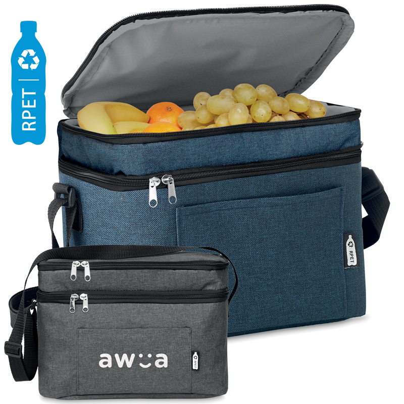 600D RPET duotone koeltas met 2 compartimenten en PEVA voering.