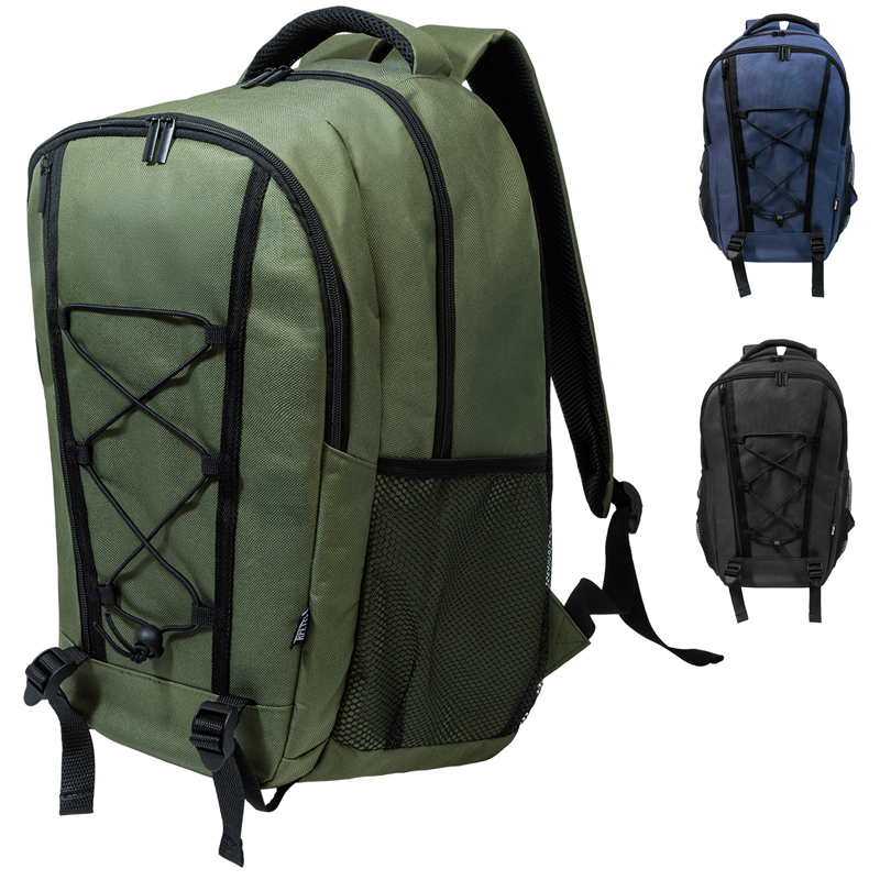 RPET buitenrugzak met ritsvakken en voorvak, gewatteerd laptopvak (15 inch), zijzakken van mesh en elastische koorden aan de voorkant.