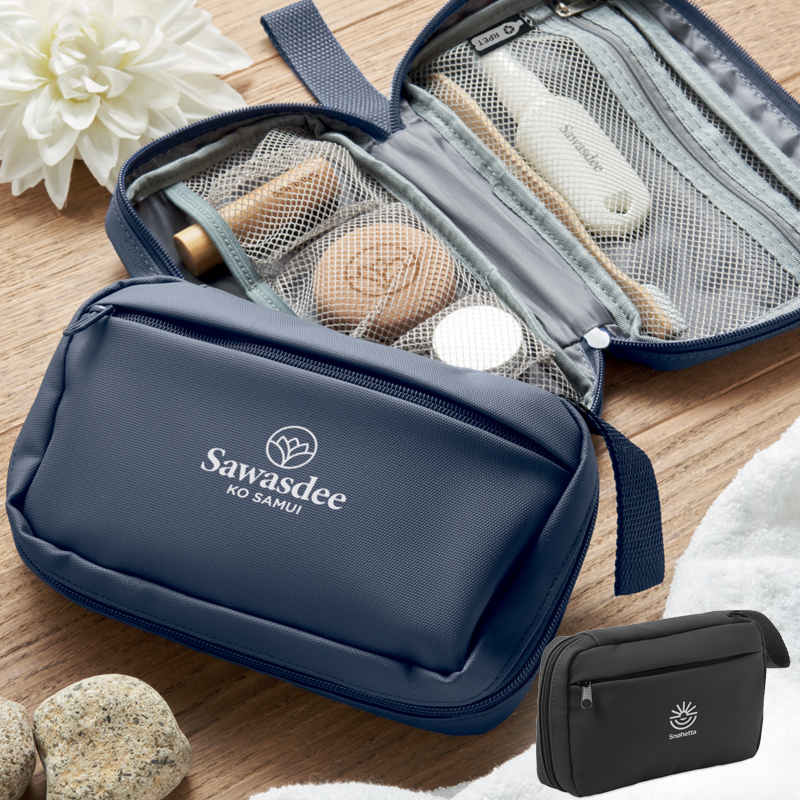 Toilettas van 600D RPET met PU–coating, RPET–mesh en 210D RPET–voering.