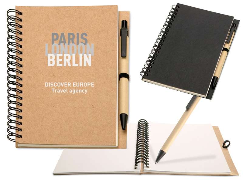 Notitieboekje met 70 vel blanco gerecycled papier, inclusief biologisch afbreekbare en gerecyclede balpen.