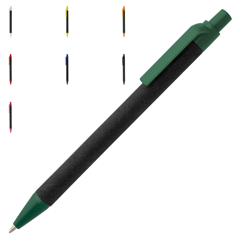 Gerecycleerde papieren balpen met zwarte behuizing en gerecyclede ABS-onderdelen.