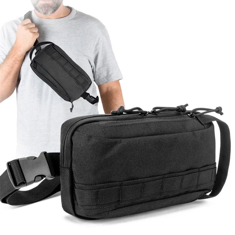 De tas heeft een verstelbaar handvat en riem waardoor het om de taille of op de schouder gedragen kan worden.