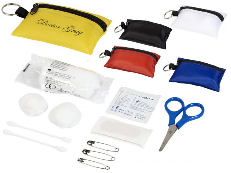 Handig polyester etui met sleutelring met 16 EHBO-benodigdheden.