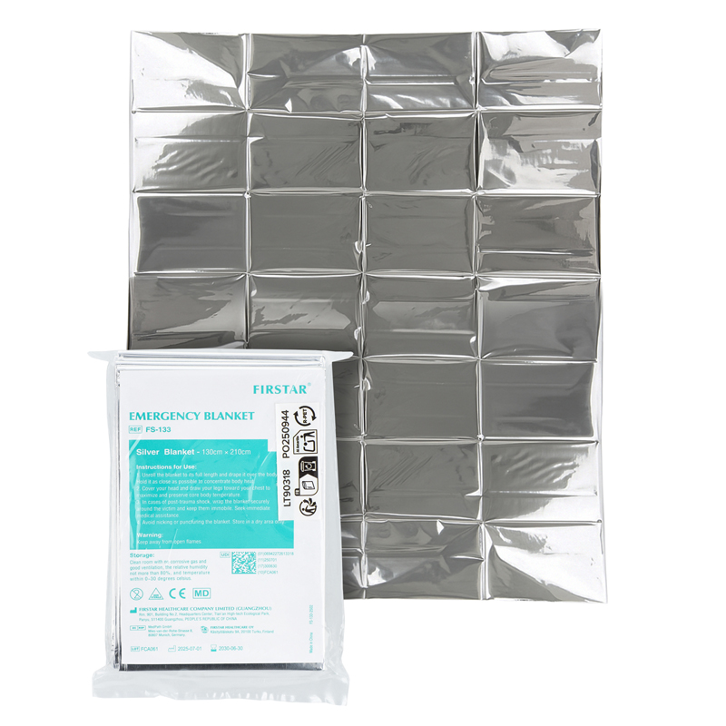 EHBO nooddeken van PET-film, ontworpen om lichaamswarmte vast te houden en bescherming te bieden tegen onderkoeling in noodsituaties.