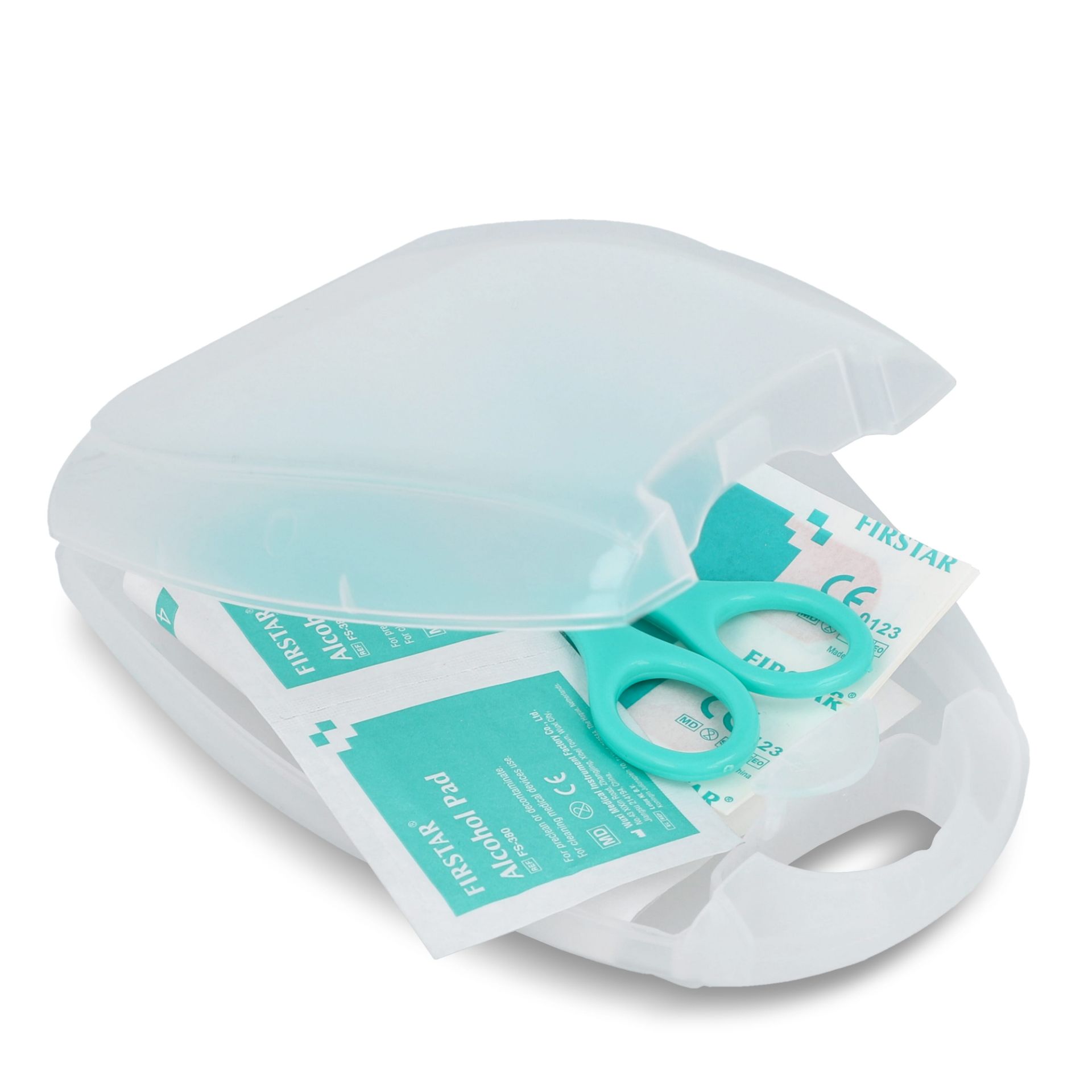 Inhoud: 2 × alcoholpads, 5 × pleisters 72 × 19 mm, 1 × schaar, 1 × medische tape 1,25 × 4,5 m, 1 × non-woven sponzen 2" × 2" 4-laags (5 stuks/pack).