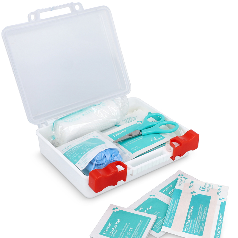 Uitgebreide EHBO set in stevige PP-doosje, voldoet aan Europese normen.