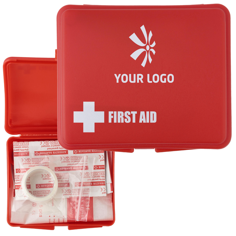 10–Delige EHBO set in kunststof cassette, bestaande uit 2 alcoholdoekjes, 5 pleisters, tape, sponsdoekje en een schaar.