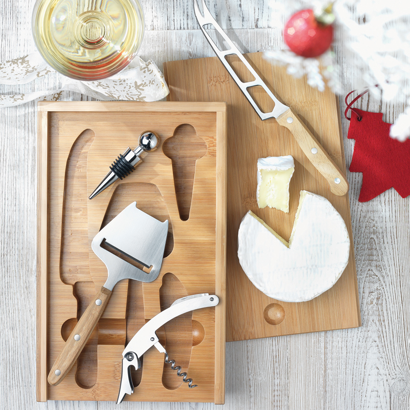 Bamboe kaas- en wijnset met een roestvrijstalen mes, kaas schilmesje, flessenopener en wijnstop.