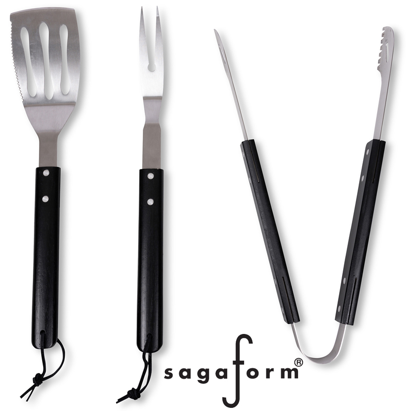 Fredde BBQ barbecuegerei van Sagaform met een praktisch ontwerp van roestvrij staal met zwart gebeitste handgrepen van hout en een goede grip voor eenvoudig gebruik, perfect voor een barbecue.