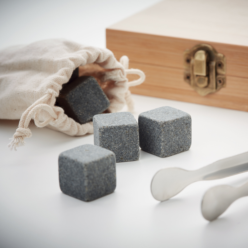 Bamboe giftbox gevuld met 9 herbruikbare ijsblokjes van steen met katoenen opbergzakje en ijsblokjestang.