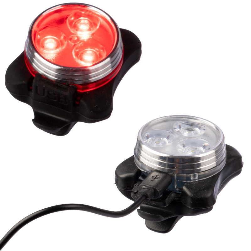 Oplaadbare fietslampjes van ABS en silicone (set van twee) met 3 LED–lampjes met 4 verlichtingsstanden en een batterijcapaciteit van 650 mAh.