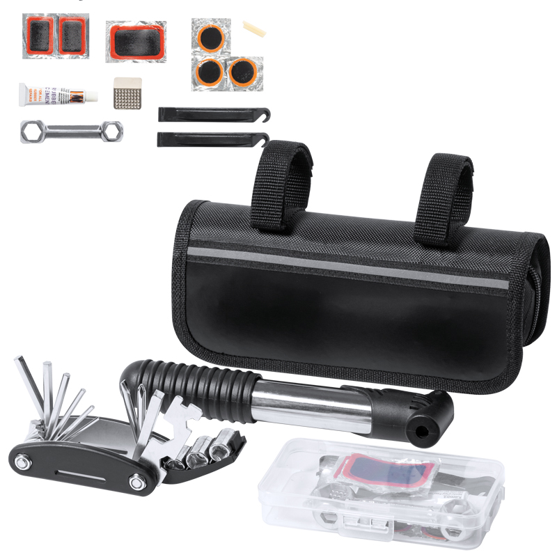 Inclusief: multitool met 15 functies, inbussleutel, minipomp en bandenreparatieset (2 bandenlichters, rasp en 6 pleisters).