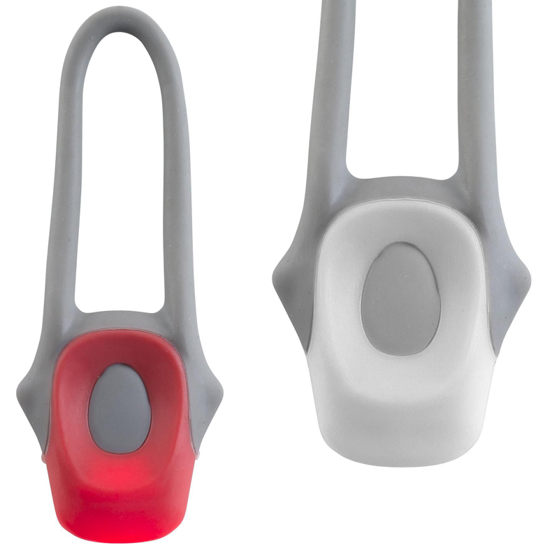 Kunststof fietslamp met twee LED lampen met knipperfunctie, siliconen bevestigingsband en aan/uit–knop.
