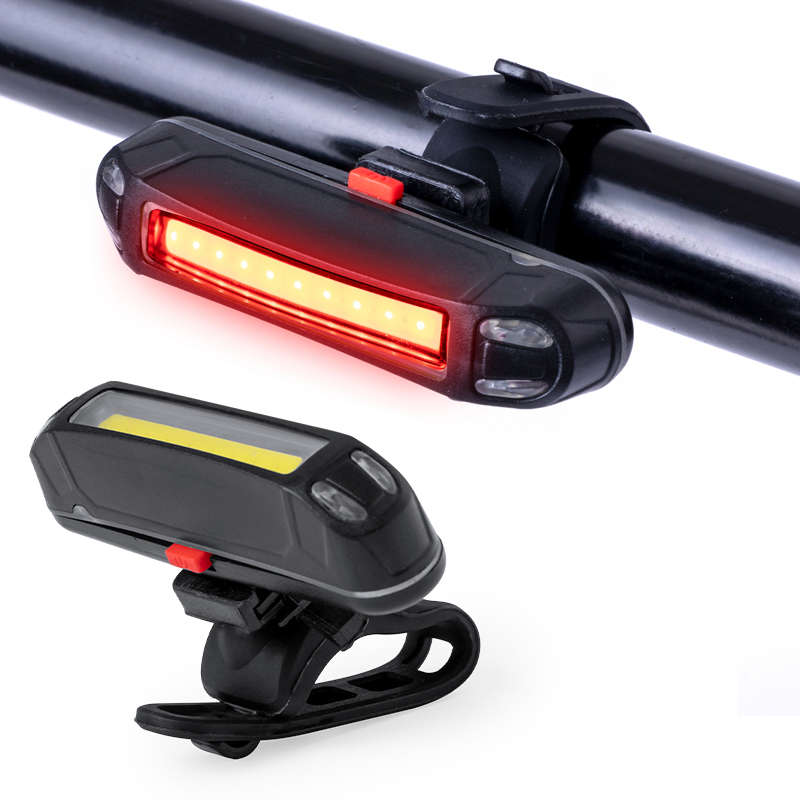 Fietsveiligheidslicht met vijf lichtstanden: vast wit of rood; rood knipperend (snel of langzaam); gecombineerd met wit en rood licht.