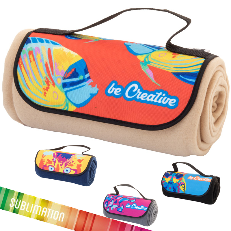 Custom made RPET polar fleece deken (200 g/m2) met klittenband handvat in 600D RPET polyester.
