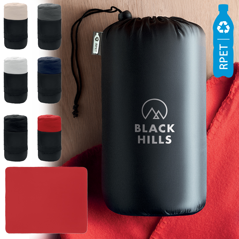 Reisdeken van RPET fleece verpakt in een RPET polyester hoes.