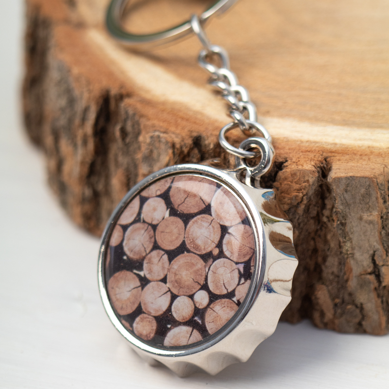 Metalen sleutelhanger in de vorm van een flesdop met flesopener.