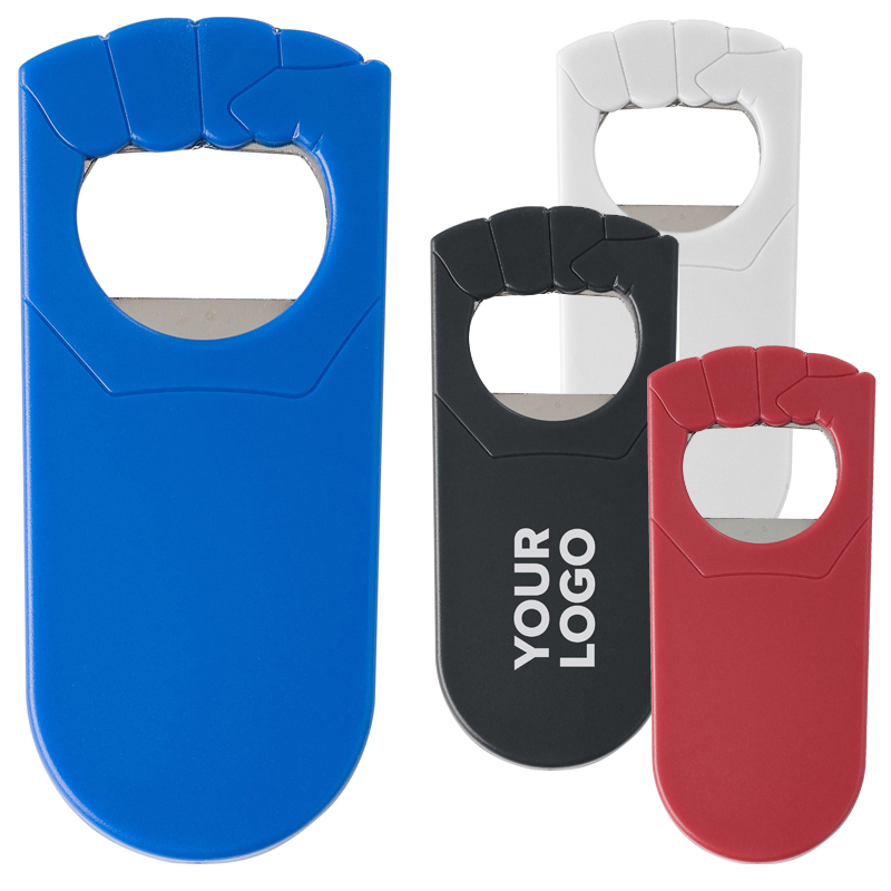 Kunststof en metalen flessenopener in de vorm van een vuist.