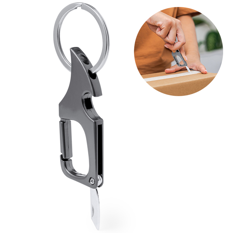 Handige metalen opener met sleutelhanger en karabijnhaak voor snelle bevestiging.