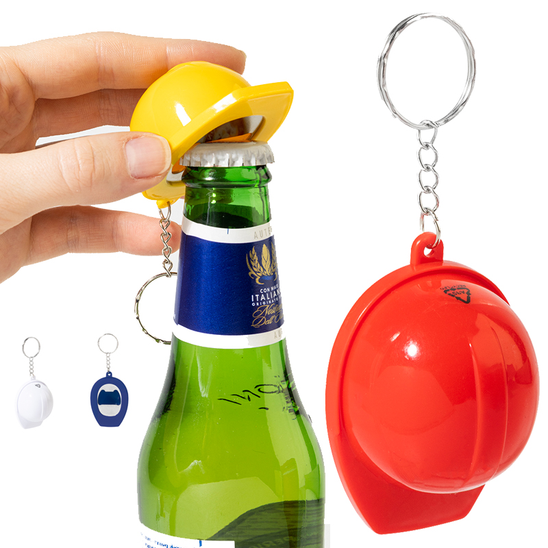 Gerecycleerde ABS veiligheidshelmvormige sleutelhanger met flesopener.