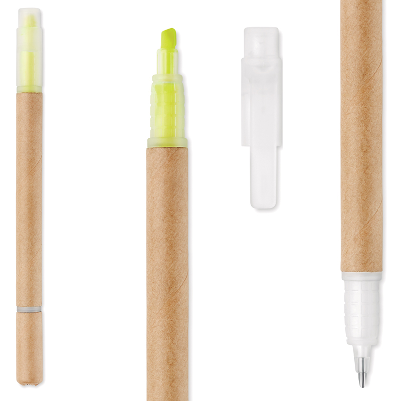 Balpen met kartonnen houder fluor gele highlighter.