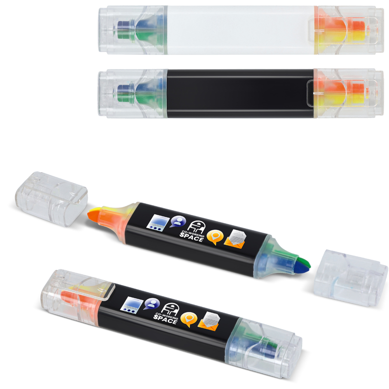 De markeerstift heeft beitelvormige schrijfpunten in de schrijfkleuren geel, oranje, groen en blauw.