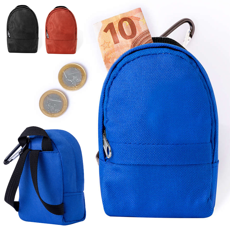Leuk portemonneetje in de vorm van een rugzak, met vak met ritssluiting, riemen en praktische karabijnhaak voor gemakkelijke bevestiging.
