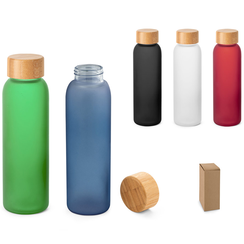 Gematteerde glazen fles met schroefdop, gemaakt van bamboe.