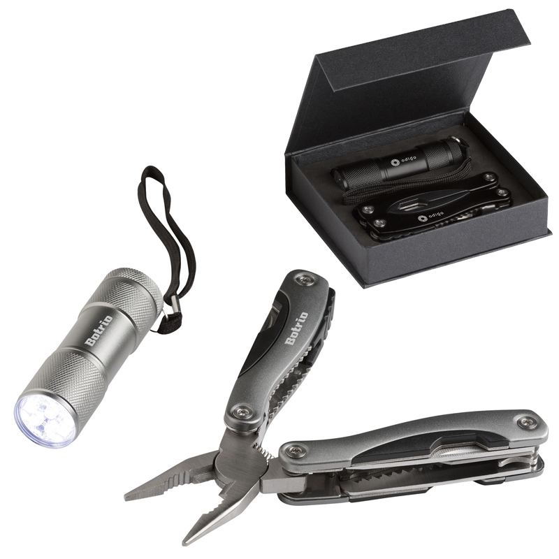 Geschenkset: 9-delige RVS multitang met 12 functies (tang, draadknipper, zaag, 2 schroevendraaiers, blikopener, flesopener, vijl, mes, philips kruiskopschroevendraaier, visschraper, visonthaker) en aluminium handgreep in metallic look.