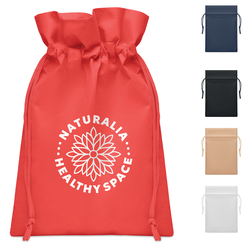 Klein trekkoord geschenktasje van RPET non–woven 80g/m2.