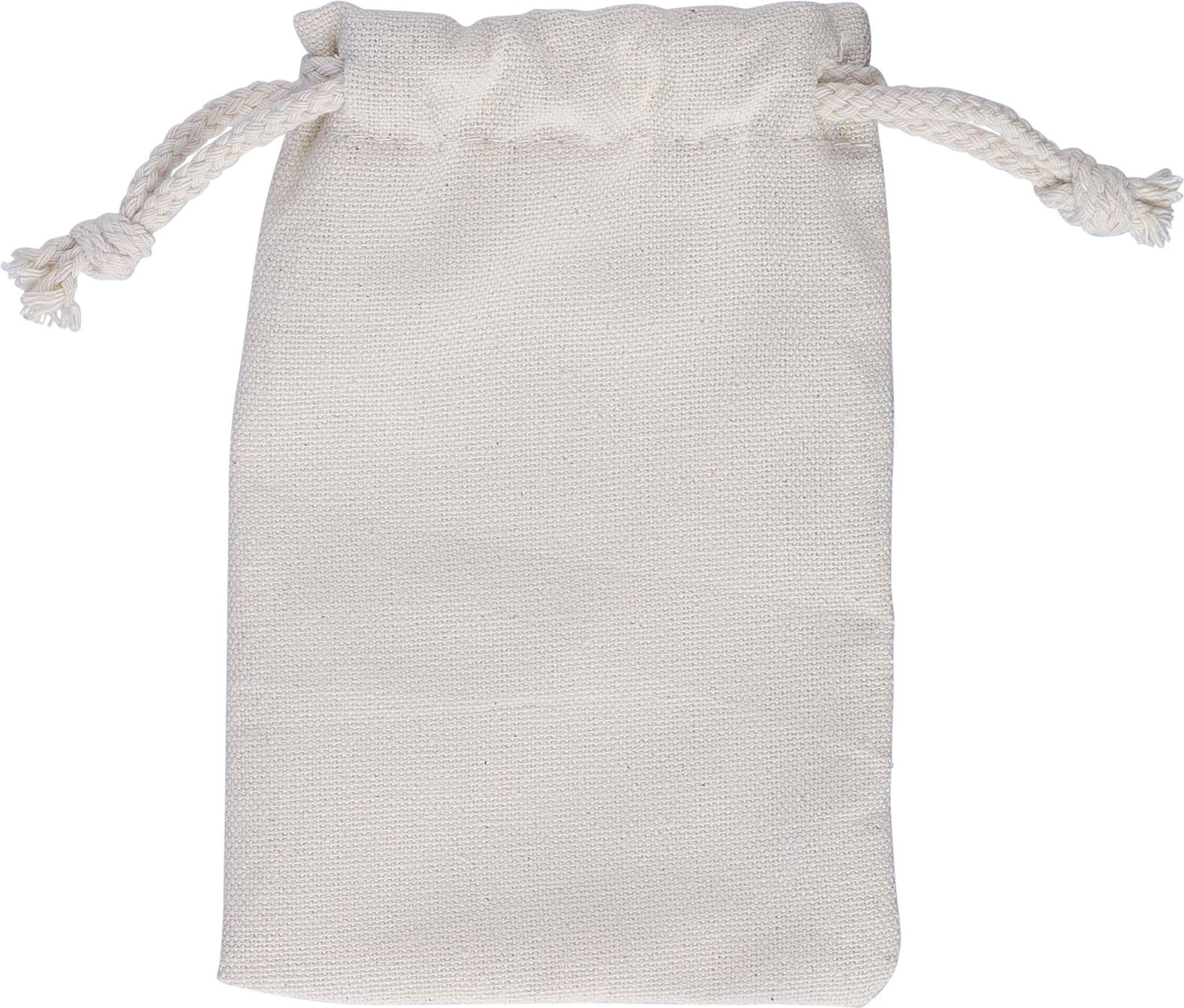 Verpakt in een katoenen trekkoordzak met een label aan de binnenzijde.