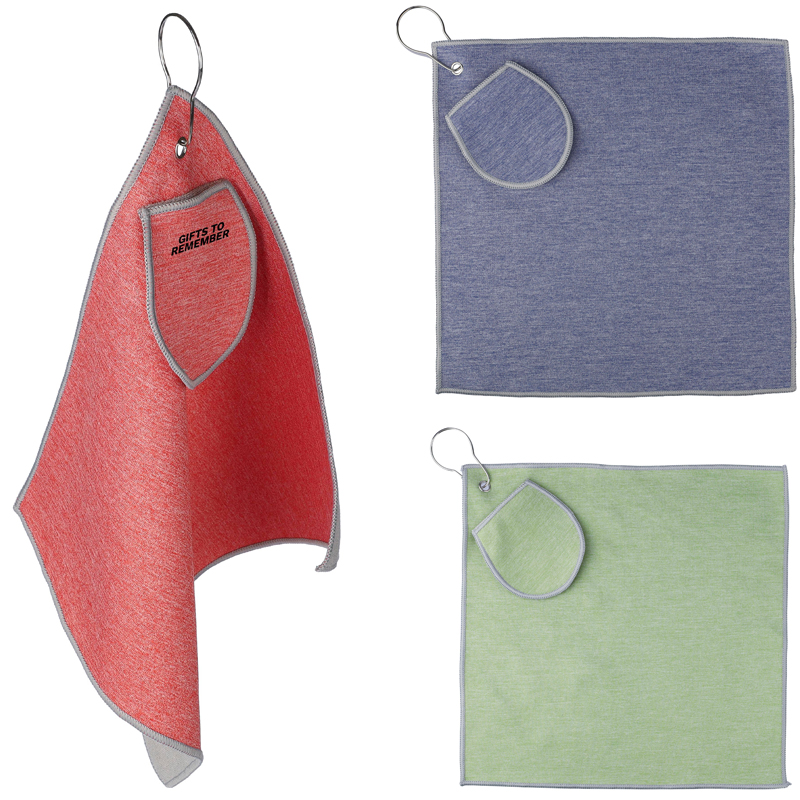rPET golfhanddoek met een geïntegreerd golfballenvak, ongeveer 31,5 × 31,5 cm.