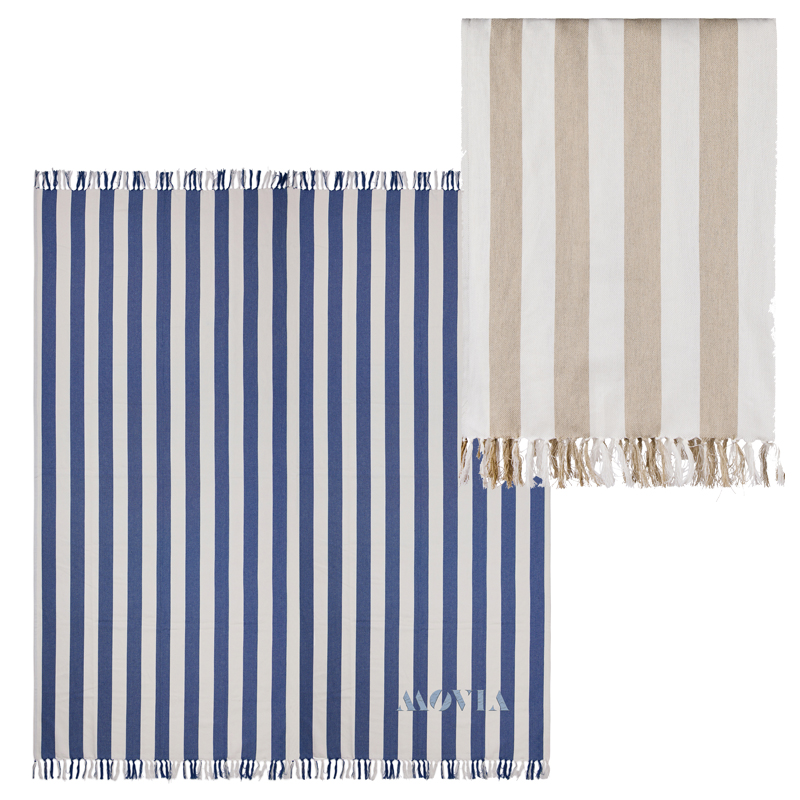 Deze strandlaken voor het hele gezin heeft een klassiek tweekleurig streepmotief met franjes aan de korte zijden.