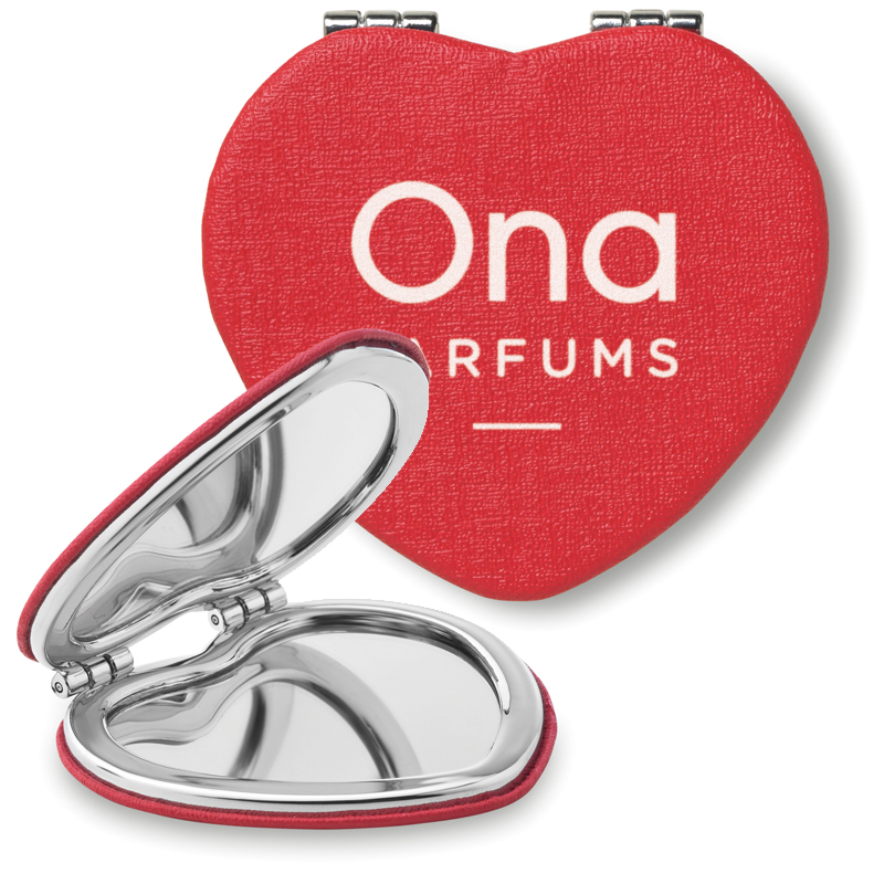 Dubbele (niet vergrotende) spiegels in hartvorm met PU omslag en magnetische sluiting.