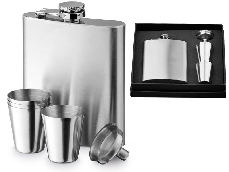 Set van roestvrijstalen heupfles of platvink 200 ml, trechter en 4x 20 ml bekers in geschenkverpakking.